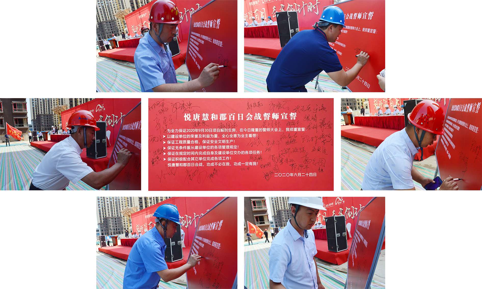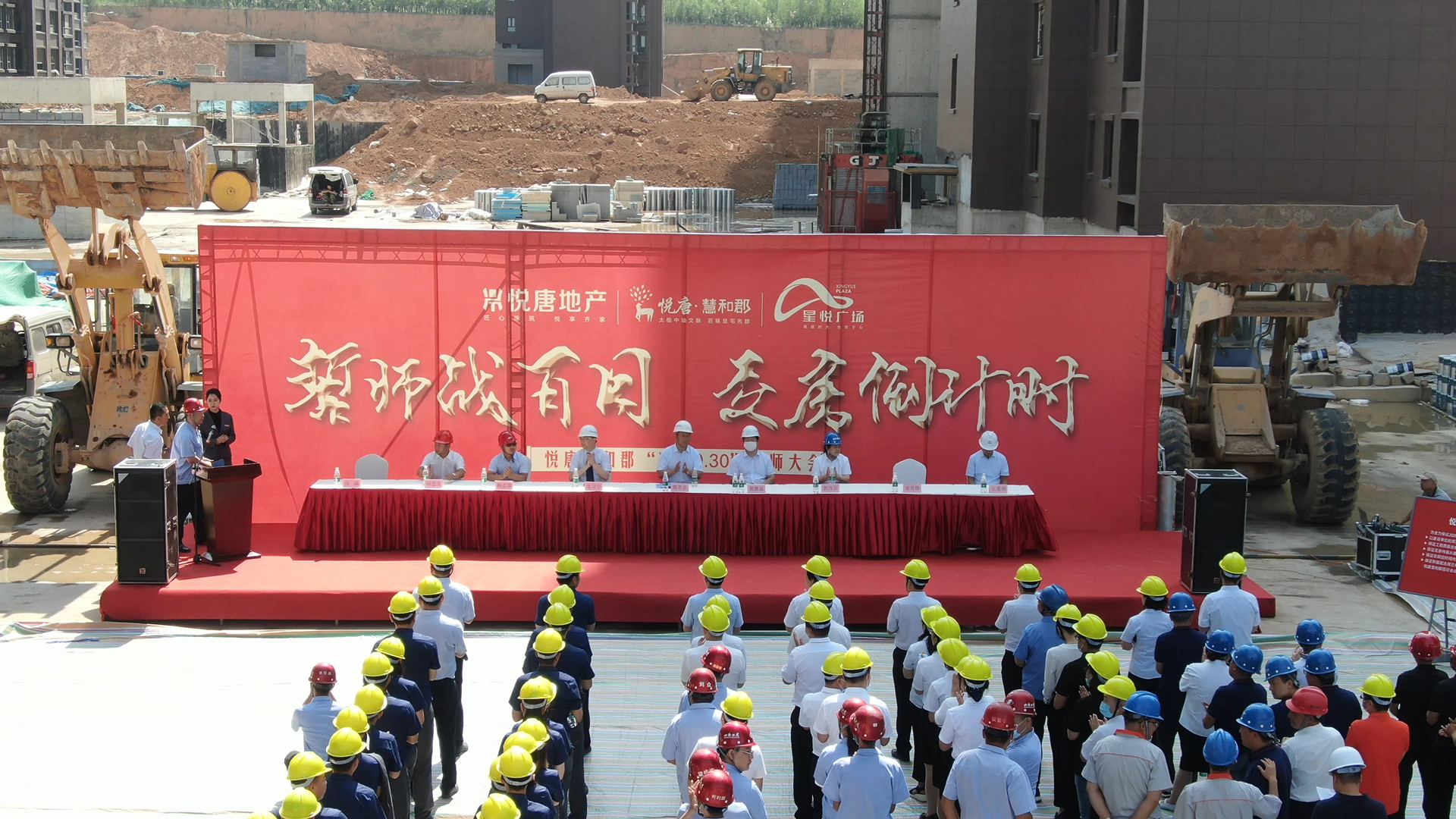 誓師戰(zhàn)百日,交房倒計時!為全力保證項目交房任務(wù)圓滿完成,嚴(yán)格兌現(xiàn)向廣大業(yè)主的承諾,2020年6月24日上午,山西悅唐房地產(chǎn)開發(fā)有限公司組織進(jìn)行“施工現(xiàn)場觀摩檢查暨工程百日會戰(zhàn)誓師大會”。中維控股集團(tuán)董事長郭秀忠先生、總裁郭雅磊先生,悅唐地產(chǎn)執(zhí)行總經(jīng)理郭改花女士、總工程師張強(qiáng)先生,以及項目各總包、監(jiān)理、分包單位負(fù)責(zé)人等主要領(lǐng)導(dǎo),中維控股集團(tuán)、各參建單位員工代表參與本次活動。